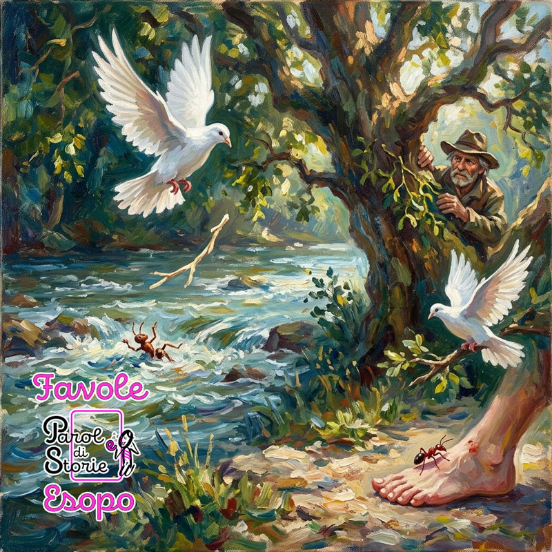 Un airone aveva dimora da parecchio tempo in uno stagno, finché divenne vecchio, e gli mancò la capacità di procurarsi qualche pesce e sfamarsi. Non gli rimase che trovare con la furbizia un nuovo metodo per trovare da mangiare. Fu così che si rivolse ai pesci dello stagno: “Pesci dello stagno, udite udite quale sventura cadrà su di voi tra qualche giorno: Gli uomini vogliono svuotare lo stagno dalle acque, vogliono prendervi tutti in un solo colpo.” Tutti pesci vennero a galla con gli sguardi terrorizzati. “Ma state tranquilli, – proseguì l’airone – perché io so che al di là di quella collina, si trova uno stagno meraviglioso, e assai più grande di questo.” I pesci si guardarono tra di loro, ma non sapevano che fare. “Io vi aiuterei, amici pesciolini, ma, come sapete io sono anziano e non riesco più a volare come prima.